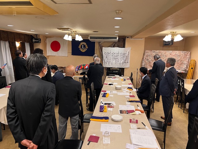 4月第一例会の雰囲気です。声高らかに国歌とともにライオンズの歌を歌い、例会開始です。